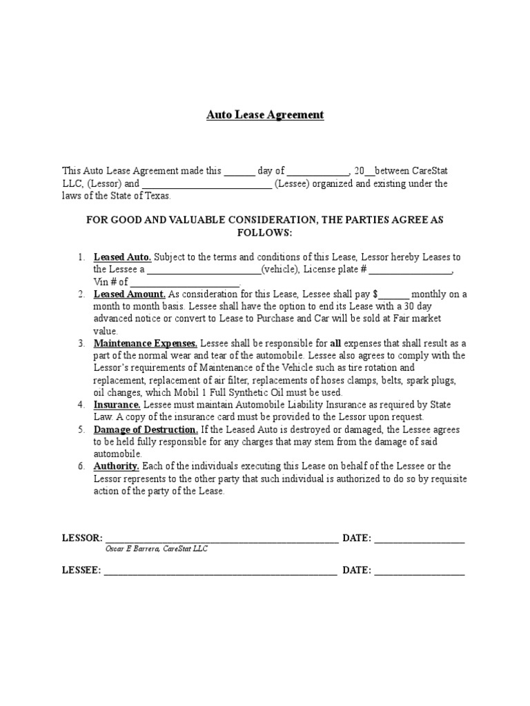 auto lease agreement template