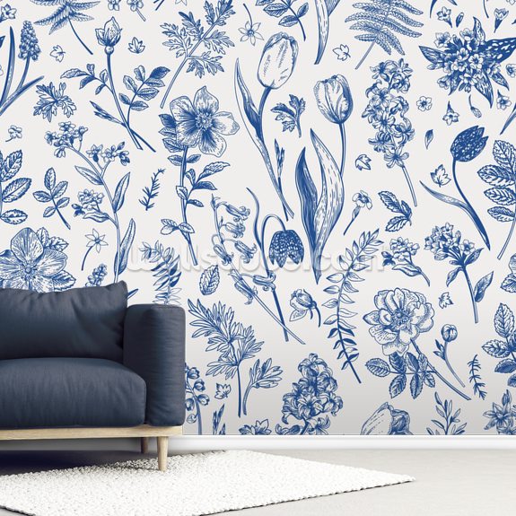 The floral blue and white wallpaper features elegant botanical patterns in soothing shades of blue on a crisp white background, creating a timeless and refreshing look perfect for both classic and modern interiors.
