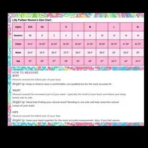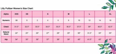 The Lilly Pulitzer size chart provides detailed measurements for bust, waist, hips, and inseam to help shoppers find their perfect fit for dresses, tops, and swimwear, ensuring a comfortable and flattering look.